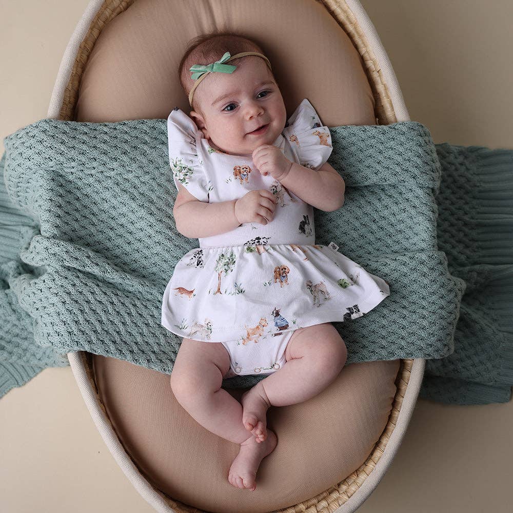 Soft and stretchy, our dresses are easy-care and very comfy for bub. The sizes up to and including size 1 come with a snap underbody to go over a nappy. Size 2 and up doesn't have the snap body feature. We have really focused on the details and ensured the dresses up to size 1 are short enough so that a baby can crawl and not trip over the skirt. Size 2 and over, when they're walking, is a bit longer.